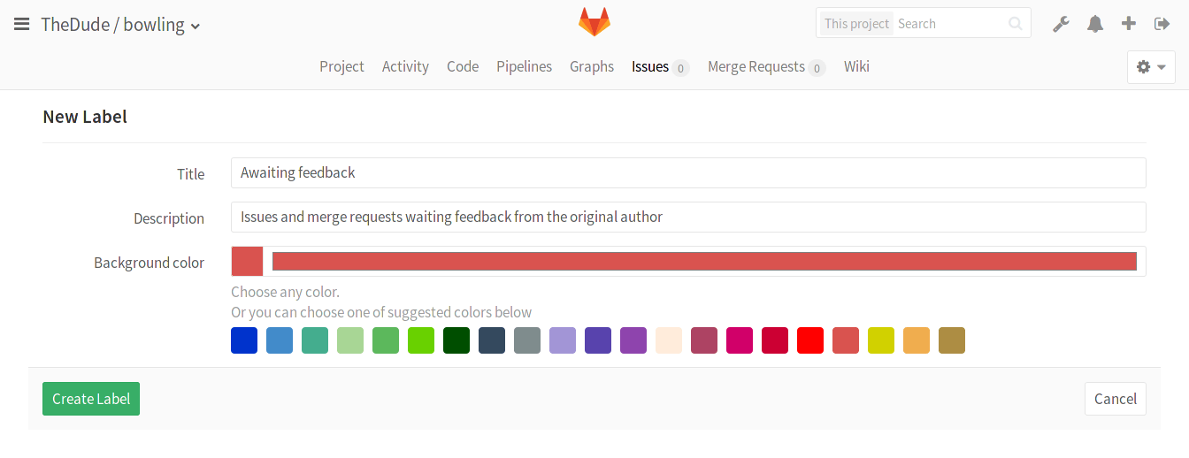There are times when you are already in the issue tracker searching for a label, only to realize it doesn't exist. Instead of going to the Labels page and being distracted from your original purpose, you can create new labels on the fly.